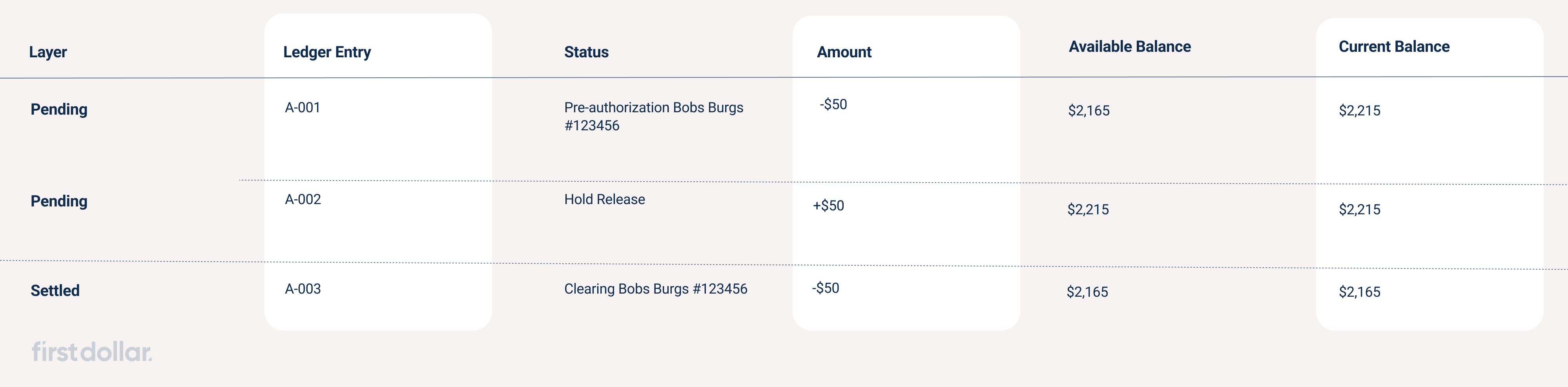 A ledger layer separates entries into discrete states to more accurately represent the flow of funds. Layers are arbitrarily defined, but the First Dollar system uses two layers: pending and settled. The pending layer represents financial events that aren't yet complete (e.g., ACH holds and card pre-authorizations). The settled layer represents completed events; funds are available or spent based solely on this layer. Separating entries into layers enables richer balance calculations and better reflects the true state of funds throughout a transaction's lifecycle.