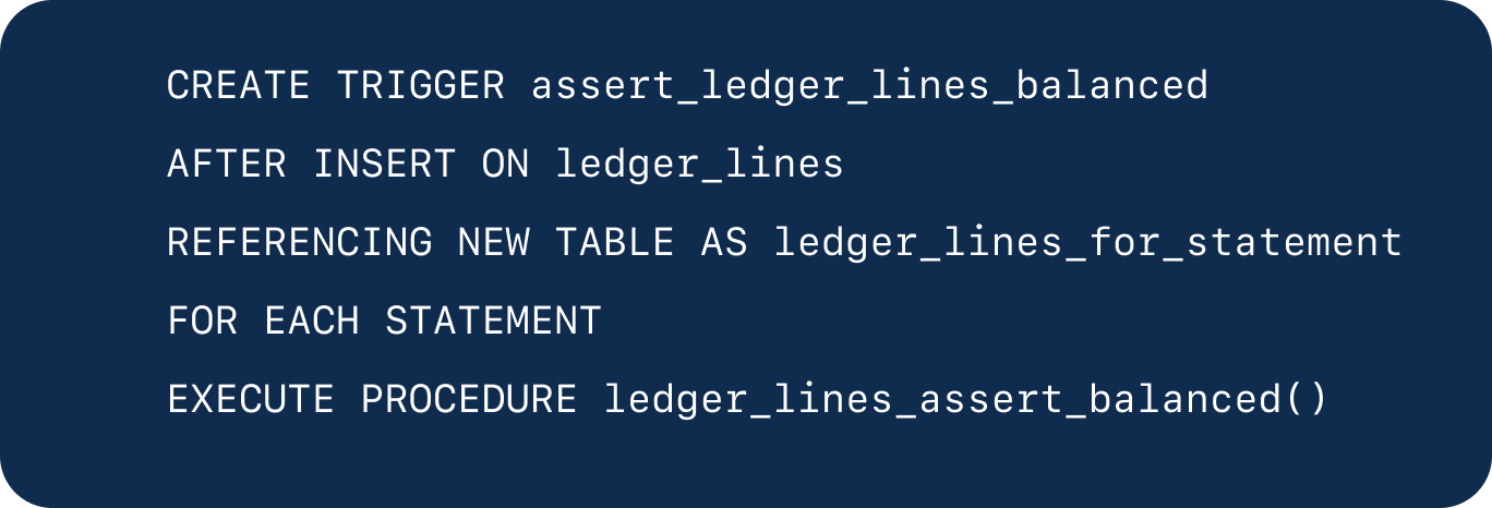 We can also apply ledger constraints at the database level. The “balanced entry” constraint –  the fundamental law of double-entry accounting — is well suited for this.  A PostgreSQL trigger maintains this data integrity.