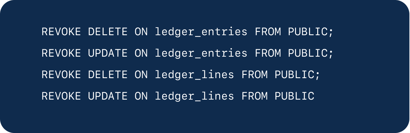 Ledger entries should be immutable—once recorded, never changed. In SQL, we achieve this by revoking DELETE and UPDATE permissions on the ledger tables.