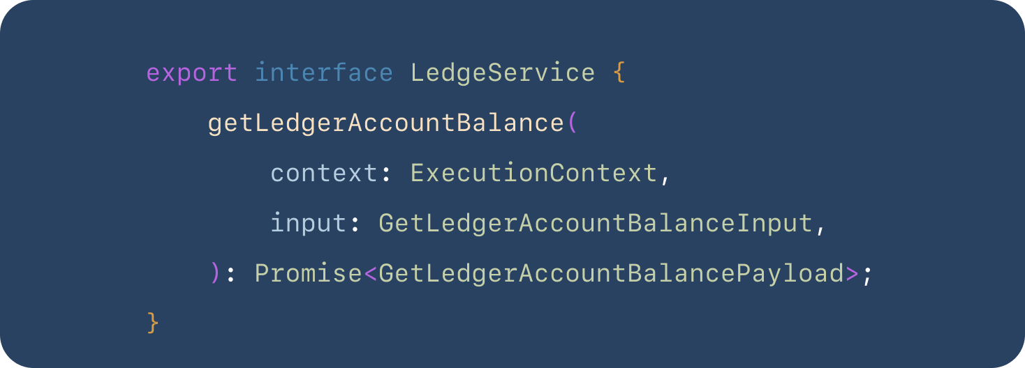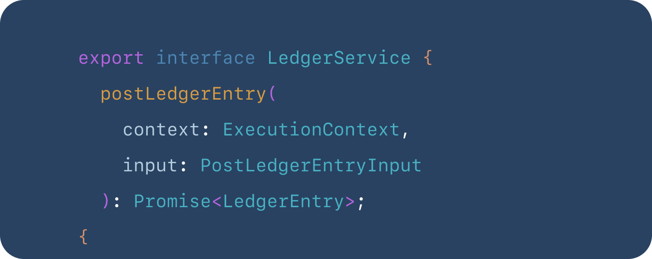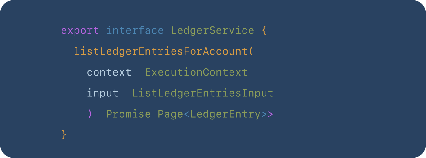 We focused on simplicity and defined the narrowest possible API.  Writing to the ledger happens through a single API – postLedgerEntry. createAccount is a necessary precondition to post entries. The two core read APIs follow.