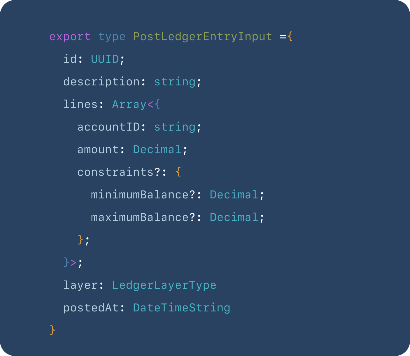 The central operation of a ledger is the ability to record transactions between accounts. We call this a ledger entry and call this the `postLedgerEntry` API.