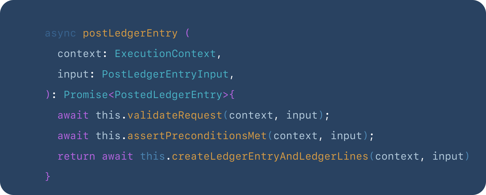 Using the primitives we developed above – `postLedgerEntry` in particular – we derive higher-level operations for convenience and correctness. A few such operations in our system include: