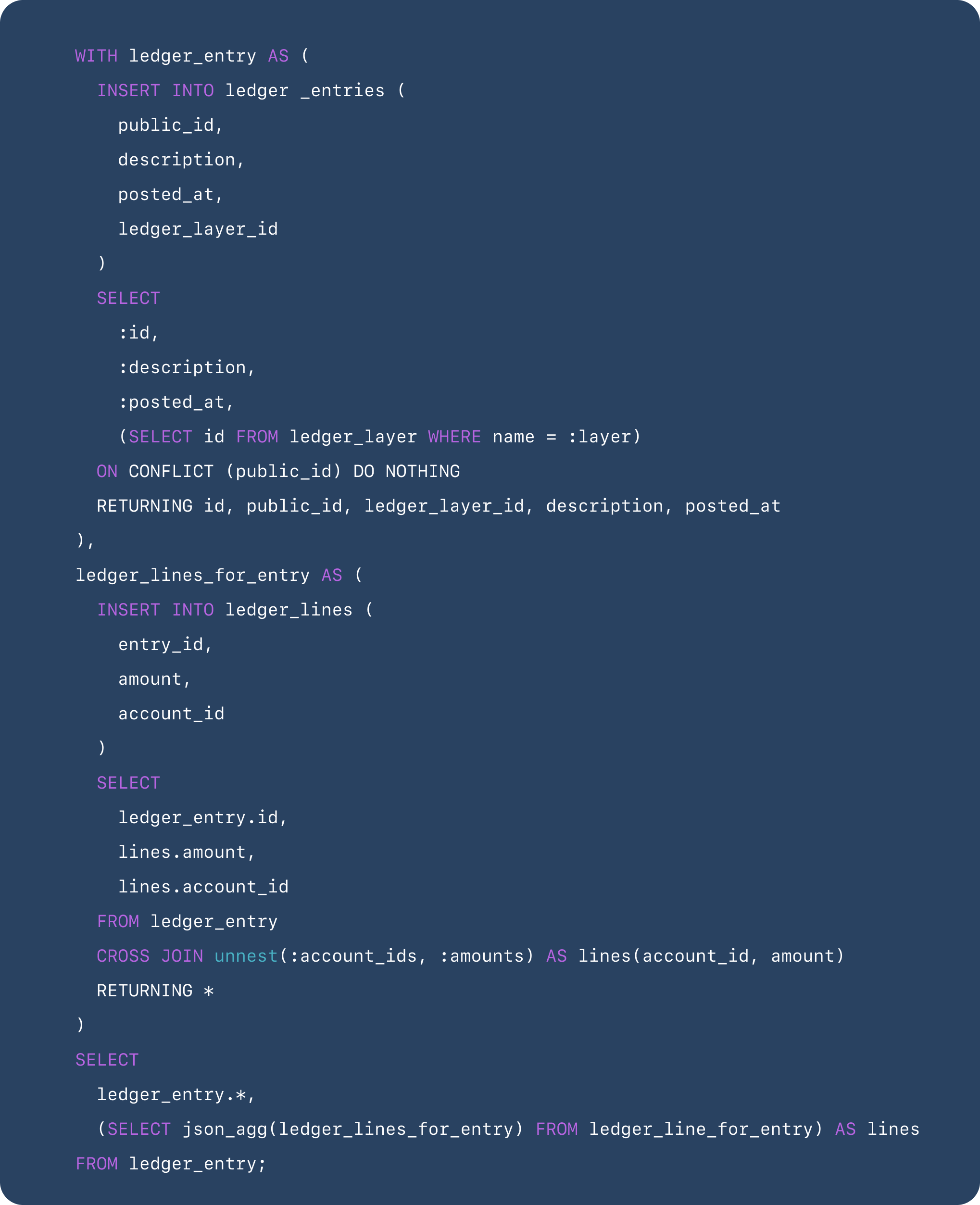 Within a single statement – or transaction – we insert the `ledger_entry` row and insert each line for the entry. Preconditions are validated at the application layer, and our trigger on `ledger_lines` ensures that the sum of all lines is balanced. With this implementation, we write entries to our ledger arbitrarily.