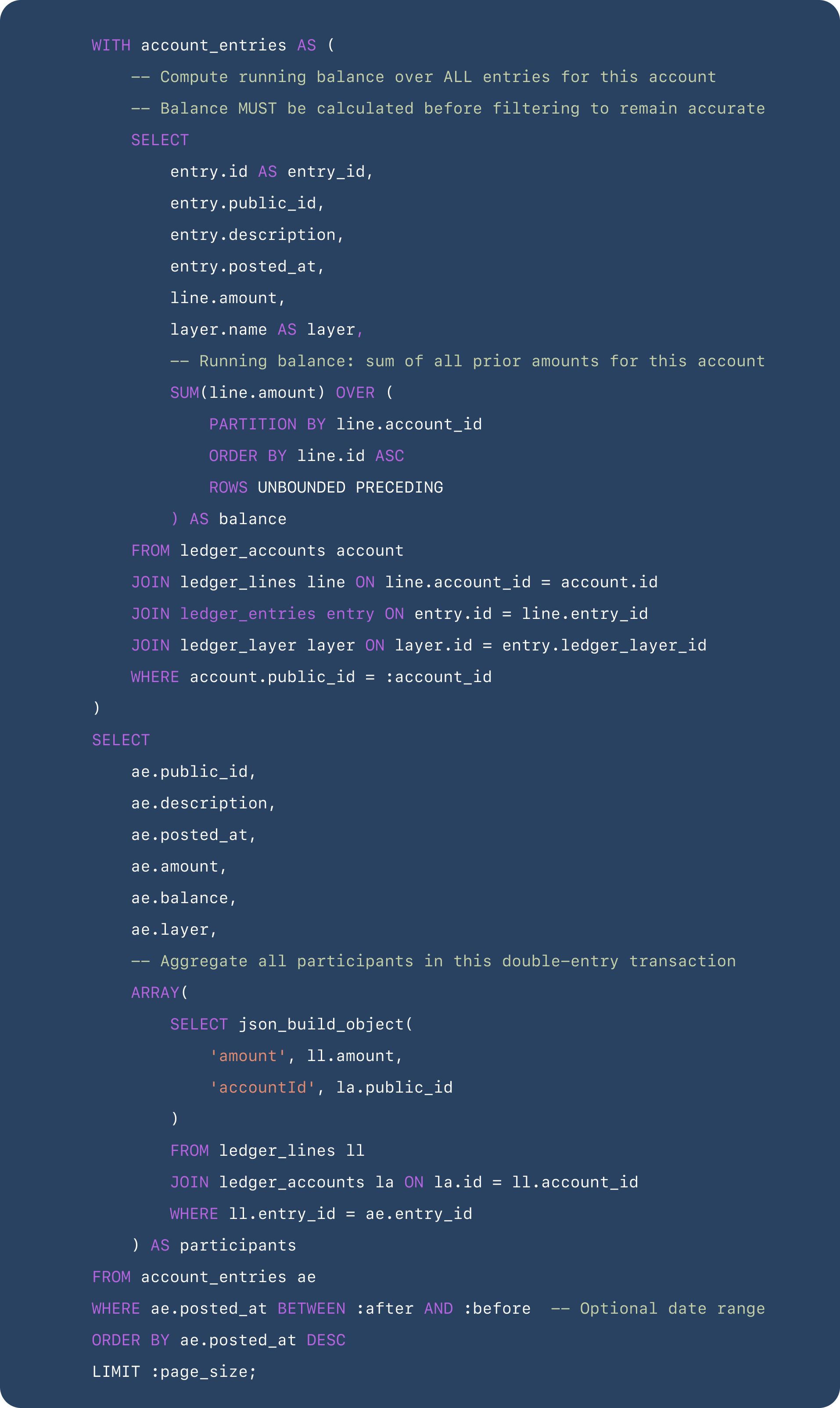 For performance, we’ll require callers to access a page of entries at a time (e.g., last 100 entries). From the relational properties of our schema, the set of entries for a given account are the ledger entries where one of the ledger lines references the account in question. The SQL statement for this view is as follows.